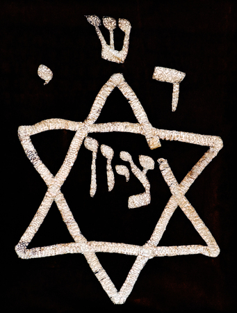 Antique decorative star of David and hebrew letters made from textured fabric on old dark fabric background.Jerusalem flea market.