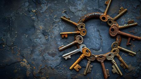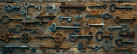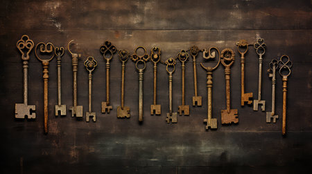 A captivating arrangement of vintage keys on a dark surface, showcasing various shapes and designs. Ideal for creativity, decor, and heritage themes.