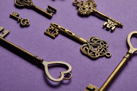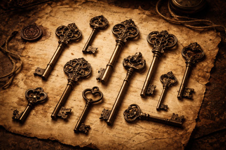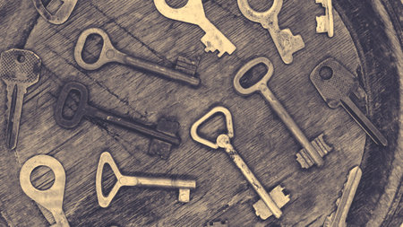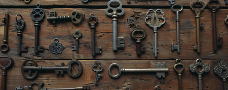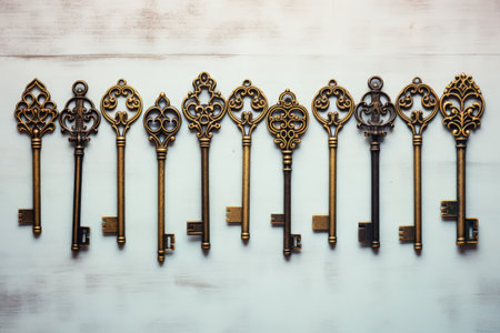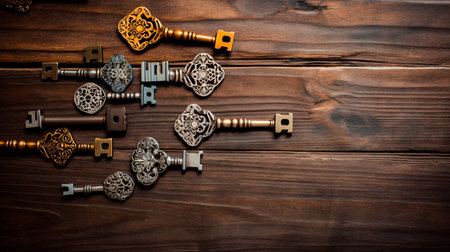 A collection of vintage keys placed on a table. This image can be used to represent concepts such as antique, nostalgia, security, or unlocking mysteries.