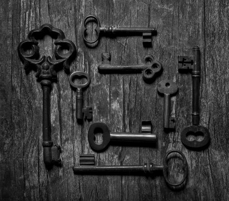 A curated collection of antique iron keys rests on a timeworn wooden surface, their varied forms speaking of countless locks and forgotten doors.