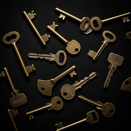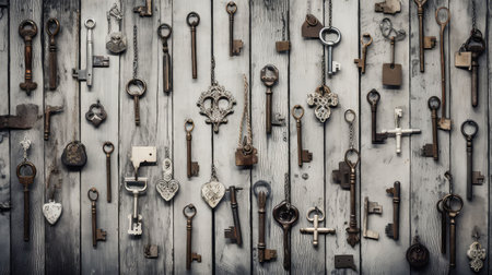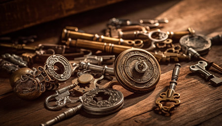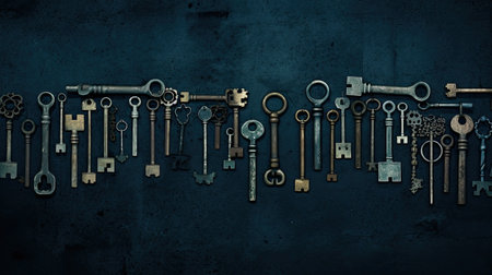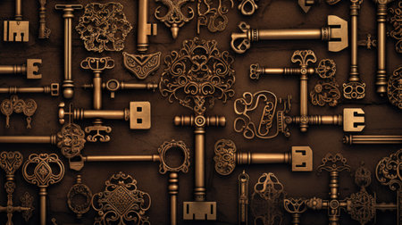 An AI generated illustration of numerous vintage keys of various shapes and sizes on a dark surface