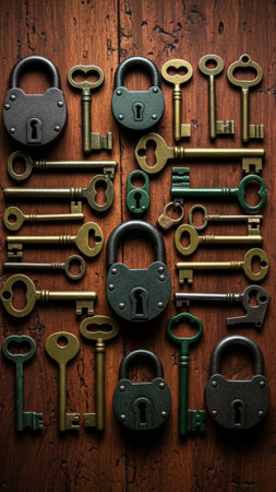 A tall, vertical 9:16 photographic concept showcasing an arrangement of antique locks and keys centr