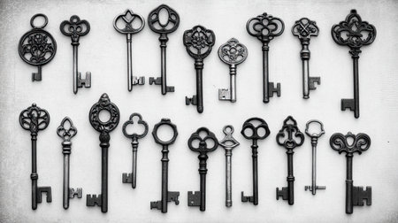 A stunning collection of vintage keys displayed on a textured background in black and white. Each key showcases intricate designs, evoking history and elegance.