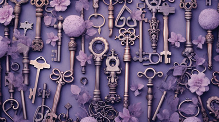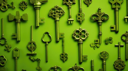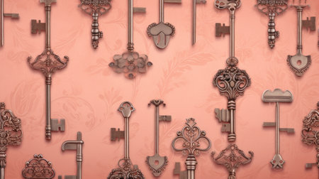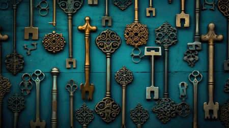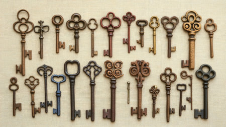A stunning arrangement of vintage decorative keys featuring intricate designs and craftsmanship. Ideal for creative projects, artistic inspiration, and vintage decor.
