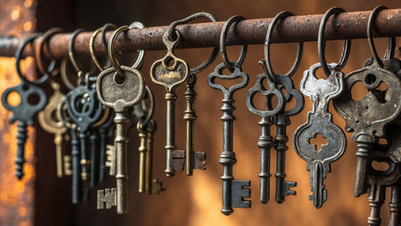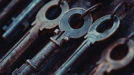 Old keys hanging on a rusty rack creating an atmosphere of mystery and history