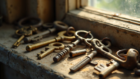An assortment of vintage brass keys on rustic windowsill in sunlight