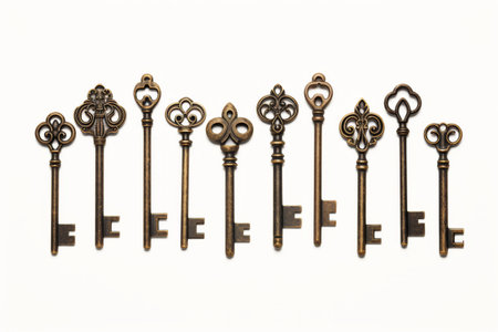 An AI generated illustration of a collection of vintage keys arranged on a white table