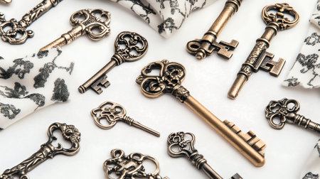 a variety of vintage keys are arranged with patterned fabric on a clean white surface. ornate and elegant.