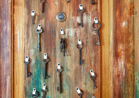Large collection of hanging old keys on shabby wooden doors and with modern peephole