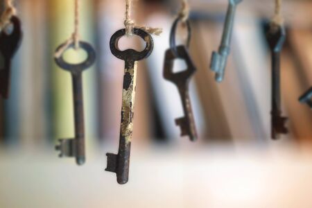 Old rusty keys hanged on the ropes with blurred book shelf background, selective focus