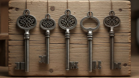 A row of five ornate, antique keys is dramatically illuminated by a single beam of light, casting long shadows. This cinematic scene evokes a sense of mystery and discovery, symbolizing the unlocking of secrets, finding solutions, or making a crucial choice.