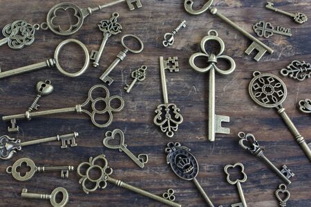 Old brass keys, detail of a classic metal keys on wooden background. Copy space for text`