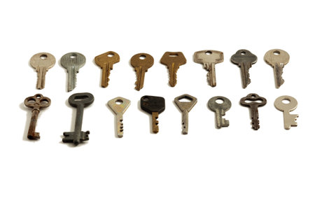 Row of Keys Sitting in a Line. A row of keys arranged neatly in a line displaying various sizes and shapes. Each key has a distinct design. On PNG Transparent Clear Background..