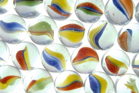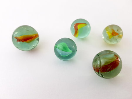 closeup of collection glass marbles toy with colorful inside isolated in white background