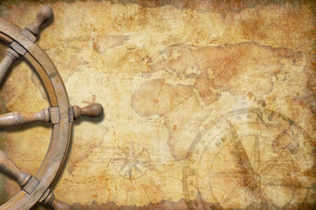 Retro vintage filtered photo of old sailing boat bridge with wooden steering wheel.