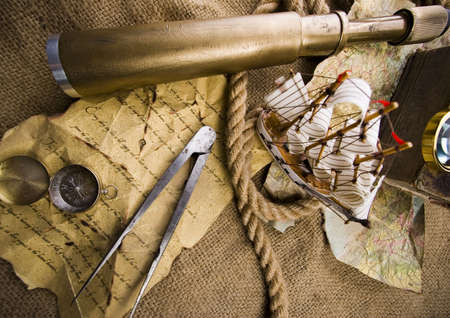 Sailboat, nauticalcompass and mooring rope on a wooden captain table background. Sea travel concept.