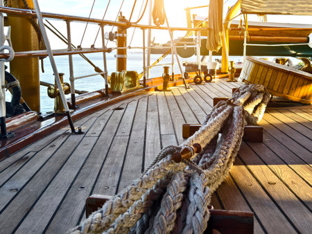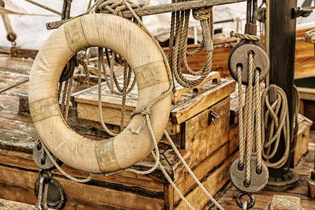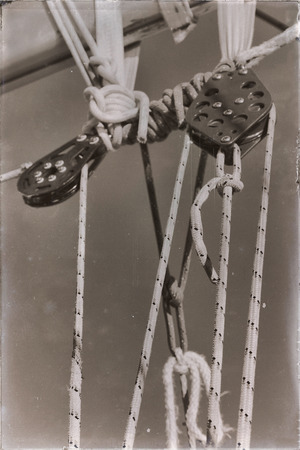 Old fashioned harbor marina sail boat ropes. Yachting details and objects concept.