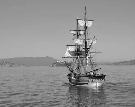 Wooden old ship in vintage style with all sails set in misty lake. Moody background.