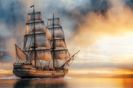 old wooden vintage pirate ship on sea water surface in sunset evening romantic time with yellow light from soft focus lantern in overboard space