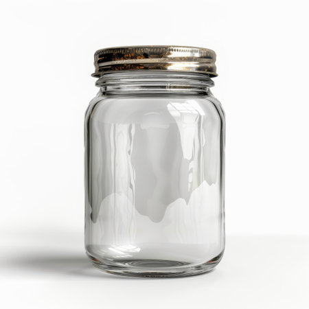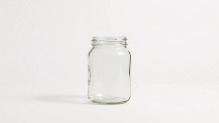 A transparent glass jar is presented against a white backdrop. The jar displays a classic design with a wide mouth and a screw-on lid, suggesting it's suitable for preserving or storing various contents. The lighting is bright, emphasizing the jar's smooth surface. Its simple style allows for diverse commercial applications.