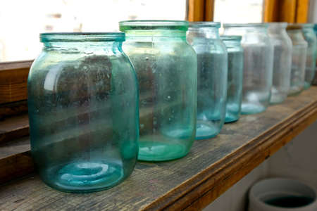 Empty glass jars on the wooden table in the kitchen. Selective focus.