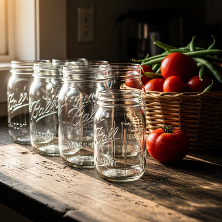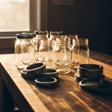 Assorted mason jars and glass containers with metal lids arranged in an organized kitchen setting