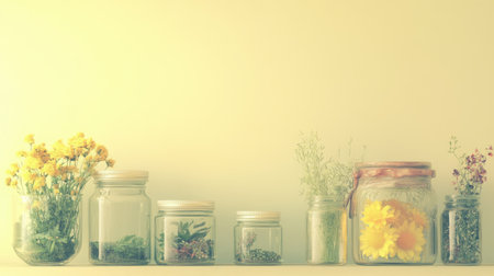 An artistic display of vibrant flowers and aromatic herbs in glass jars against a soft light background, creating a soothing ambiance perfect for home decor and gardening.