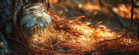 Glass jar on forest ground with autumn leaves, warm afternoon light. Nature still life concept