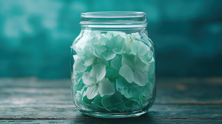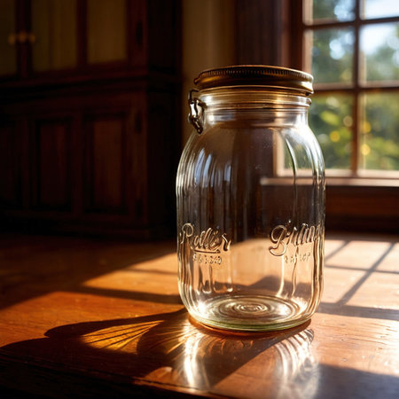 A transparent glass jar sits on a flat surface against a soft blue backdrop illuminated by gentle sunlight creating a serene ambiance.