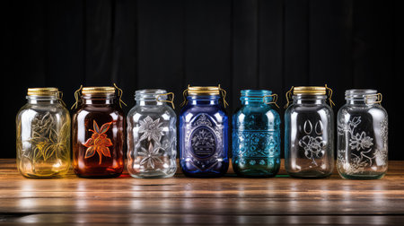 Intricately designed glass jar rests on a wooden surface, softly illuminated, creating a warm atmosphere and showing the unique craftsmanship of the piece, AI generated