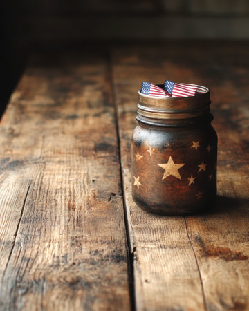 A distressed mason jar with engraved stars holds mini American flags, sitting on a rustic wooden surface. A perfect symbol of patriotism and vintage Americana.