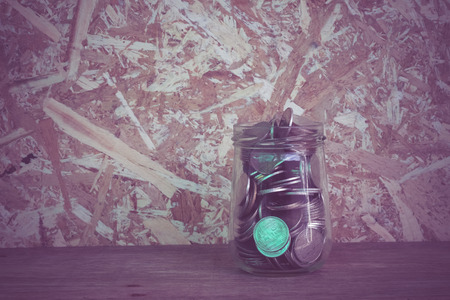 Money save coins Thai baht in the bottle glass with filter effect retro black style two color cement wall background. Concept money savings