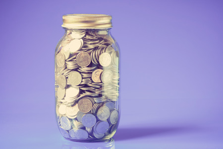 Glass jar with coins placed on white background isolated concept for saving money to keep in reserve for emergency expenses.