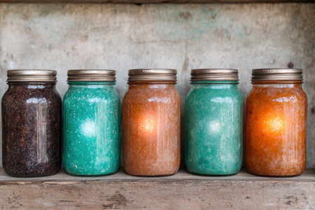 Rustic vintage jar candles with floral design on wooden shelf in cozy setting. That the image is generated using AI.
