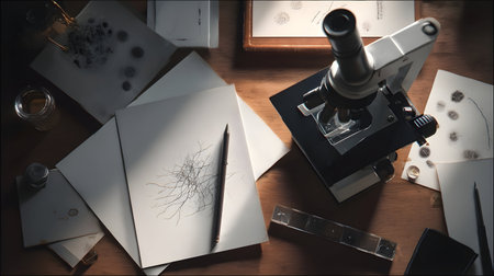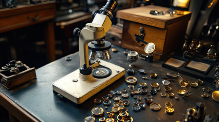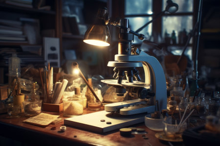 An old-fashioned microscope stands prominently on a wooden table, surrounded by a fascinating assortment of glass and metal objects, creating a vintage, scientific atmosphere.