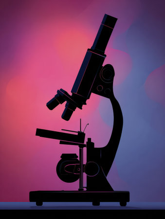 A vibrant illustration showcases a microscope rendered in shades of red, blue, and purple. The artwork employs a stylized aesthetic with bold color gradients against a dark backdrop. The image likely symbolizes scientific research and could be suitable for educational materials or commercial applications.