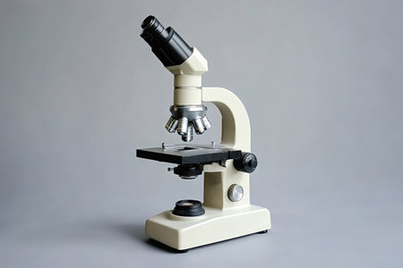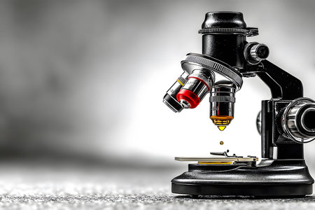 Laboratory microscope positioned on a gray background, prepared for scientific research and analysis within a sterile environment, emphasizing precision and advanced technology
