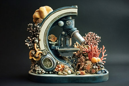 Vintage microscope examines a vibrant coral reef ecosystem, highlighting the importance of scientific research in understanding and preserving underwater environments