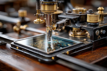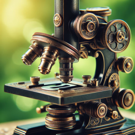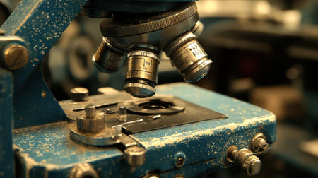 This close-up image captures the intricate details of a vintage microscope, showcasing its lenses and focus mechanism in a scientific laboratory context.