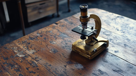 An antique brass microscope rests elegantly on a wooden table, showcasing intricate details against a soft, artistic background. Perfect for themes of science and exploration.