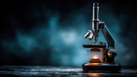This image features a vintage microscope illuminated by warm light, set against a dark and moody background, emphasizing its role in scientific research and education.