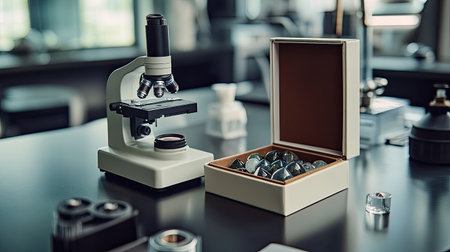 A laboratory setting featuring a microscope and a box of glass slides. The environment is bright, emphasizing the importance of precision in scientific research and analysis.