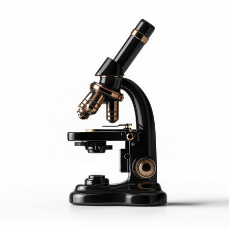 A beautifully lit microscope showcasing intricate details against a blurred dark background, ideal for science and education themes.
