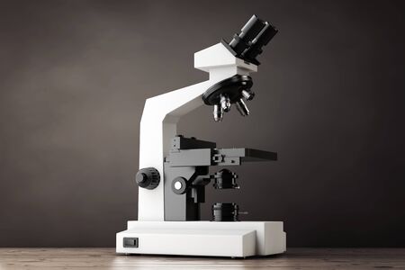 Modern Laboratory Microscope on a wooden table. 3d Rendering.