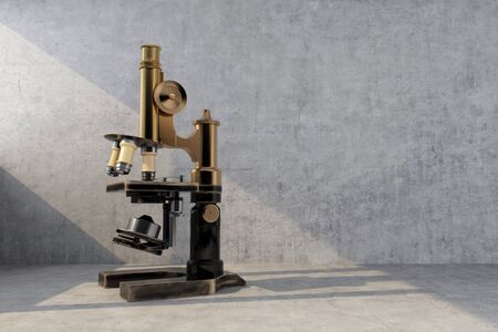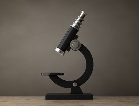 Abstract Vintage Laboratory Microscope on a wooden table. 3d Rendering.