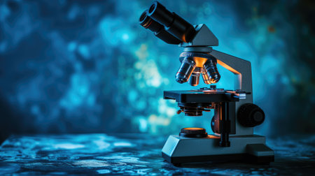 Illuminated microscope on a bokeh blue background
