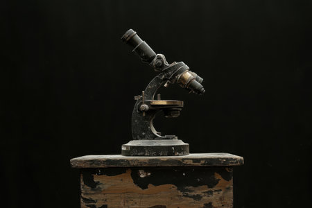 A classic microscope stands on a weathered wooden table, showing its intricate details against a dark backdrop.