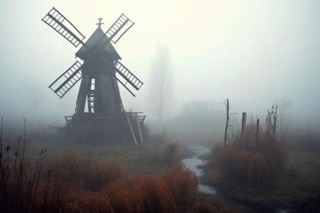Haunted windmill stands in misty landscape, surrounded by swirling clouds and eerie atmosphere