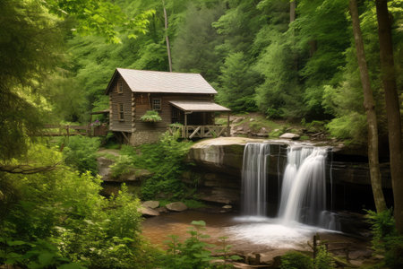 rustic log cabin surrounded by lush greenery and waterfall in the background, created with generative ai
