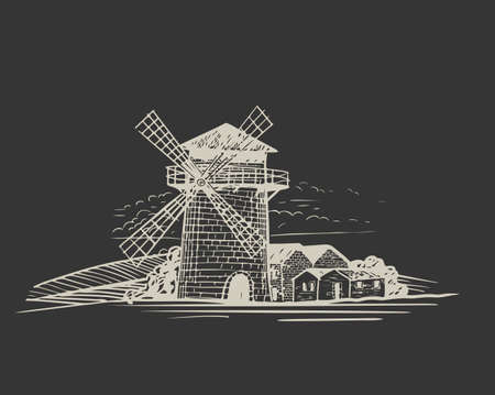 Windmill. Handwritten sketch. Black ear, on isolated background. Gluten food ingredient engraving retro style.